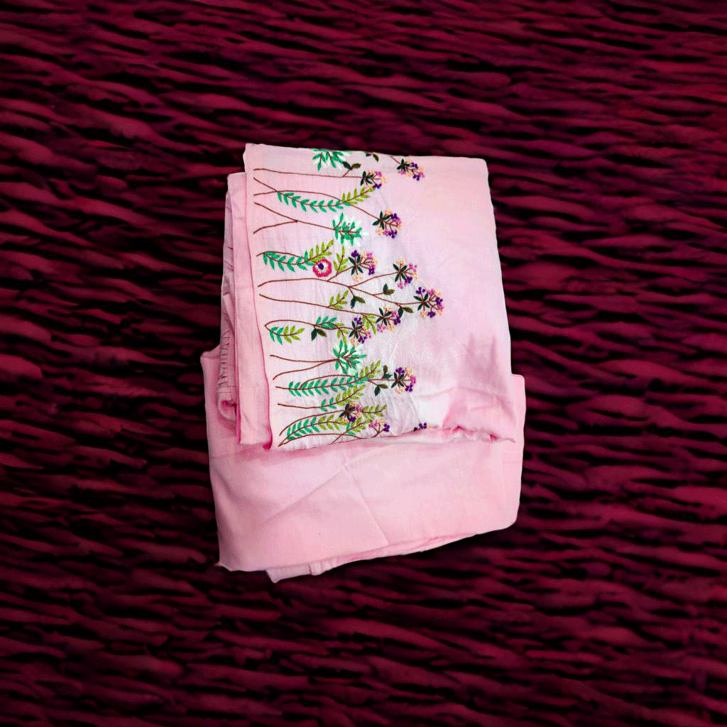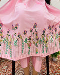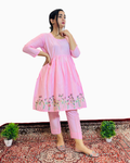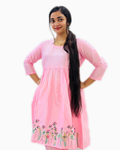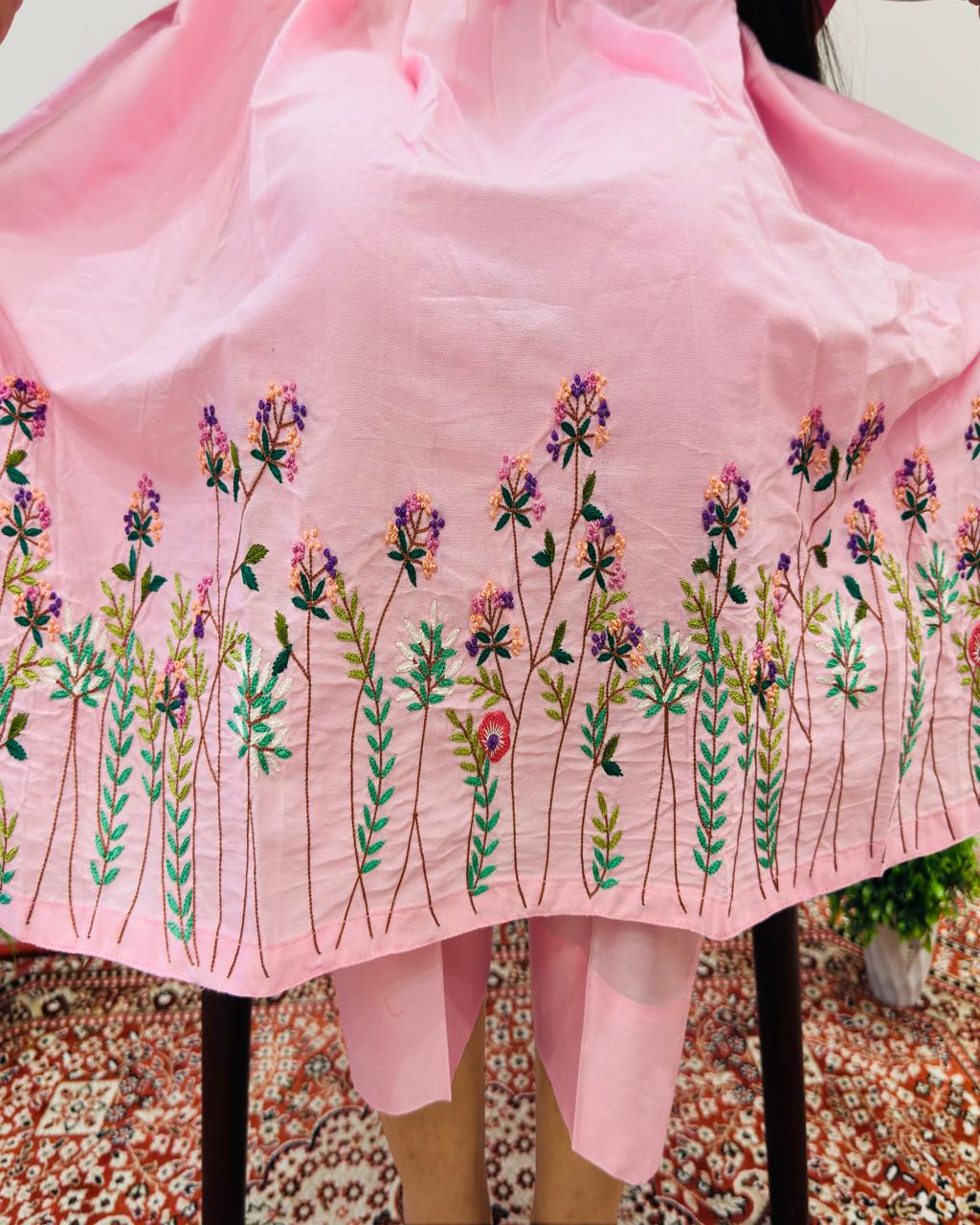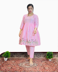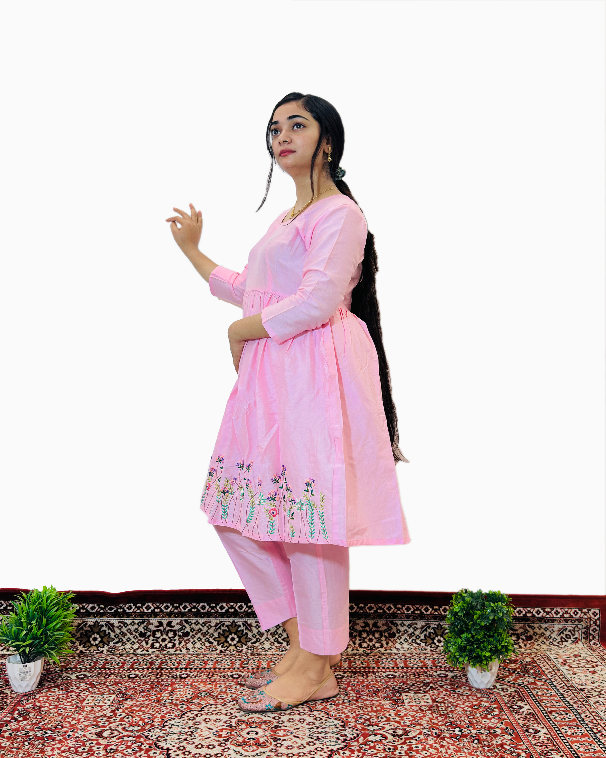 Step into effortless elegance with this Blush Pink Floral Embroidered Kurti Set, designed for the modern woman who loves a blend of comfort and style. Made from breathable cotton fabric, this charming pastel pink outfit features a beautifully flared A-line kurta with delicate floral embroidery along the hemline, paired perfectly with straight-cut matching pants.