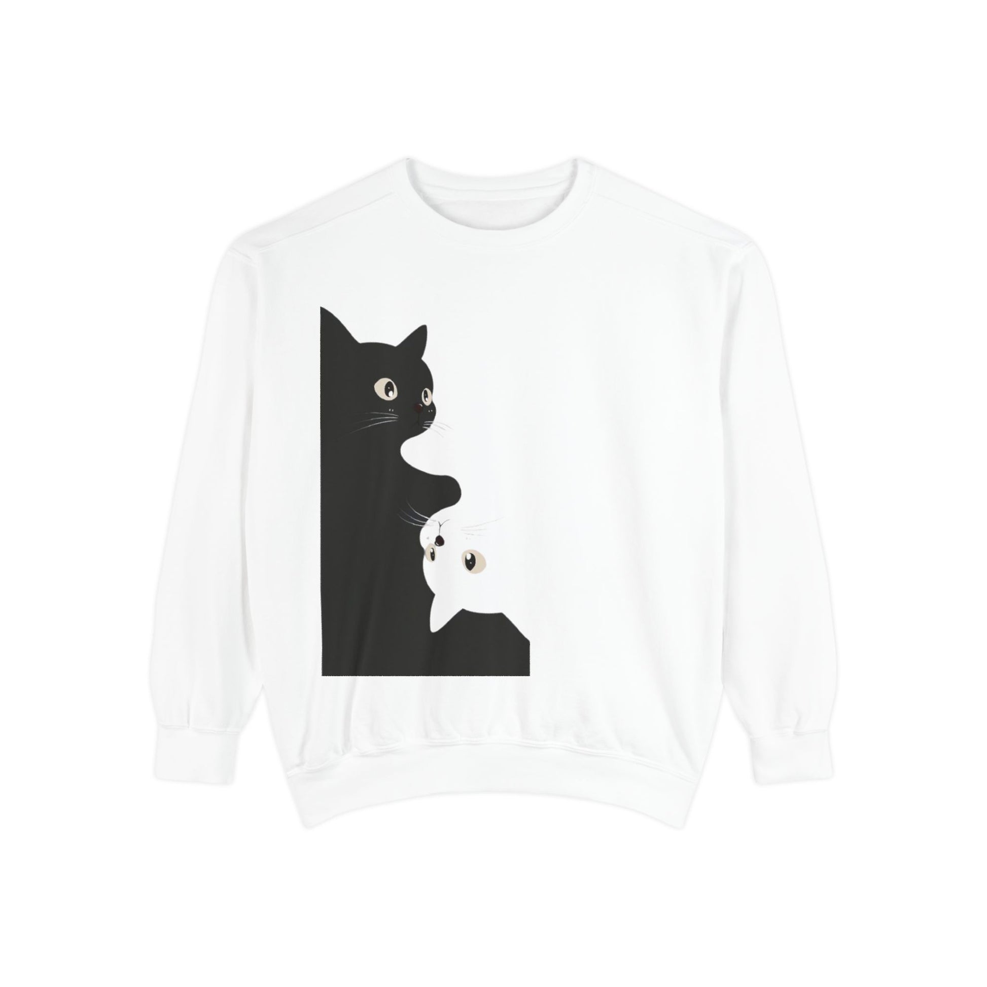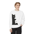 Cocoon yourself in quiet comfort with this garment-dyed sweatshirt that pairs cozy weight with a spare, artful design. A large silhouette of a watchful black cat — its alert eyes and tucked paws rendered in high-contrast ink — sits off-center on the front, while the soft white fabric keeps the image crisp and minimal. The relaxed fit and medium-heavy, ring-spun cotton blend feel substantial without being stiff. Thoughtful details like a half-moon back neck patch, ribbed collar and cuffs, and neck twill tape keep the shape over time. OEKO-TEX low-impact dyes and a smooth knit make this sweatshirt feel lived-in from the first wear. It’s the kind of piece you reach for when you want quiet style and easy warmth: for slow mornings with a mug, moonlit walks, or evenings spent reading with a purring companion.