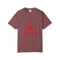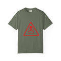 This relaxed-fit garment-dyed tee wears like an old favorite from the first wash. A bold red triangular warning motif—skull and crossed bones with the word “DANGER!”—sits centered on the chest, giving the shirt a rebellious, tongue-in-cheek edge. The medium-weight ring-spun cotton drapes softly and the pre-shrunk knit keeps the fit consistent. Tubular construction and double-needle stitched seams make it durable without side seams distracting from the clean silhouette. Available in a wide range of colors and sizes, it feels lived-in, comfortable, and confidently offbeat — great for layering under a jacket or standing alone as a statement piece.