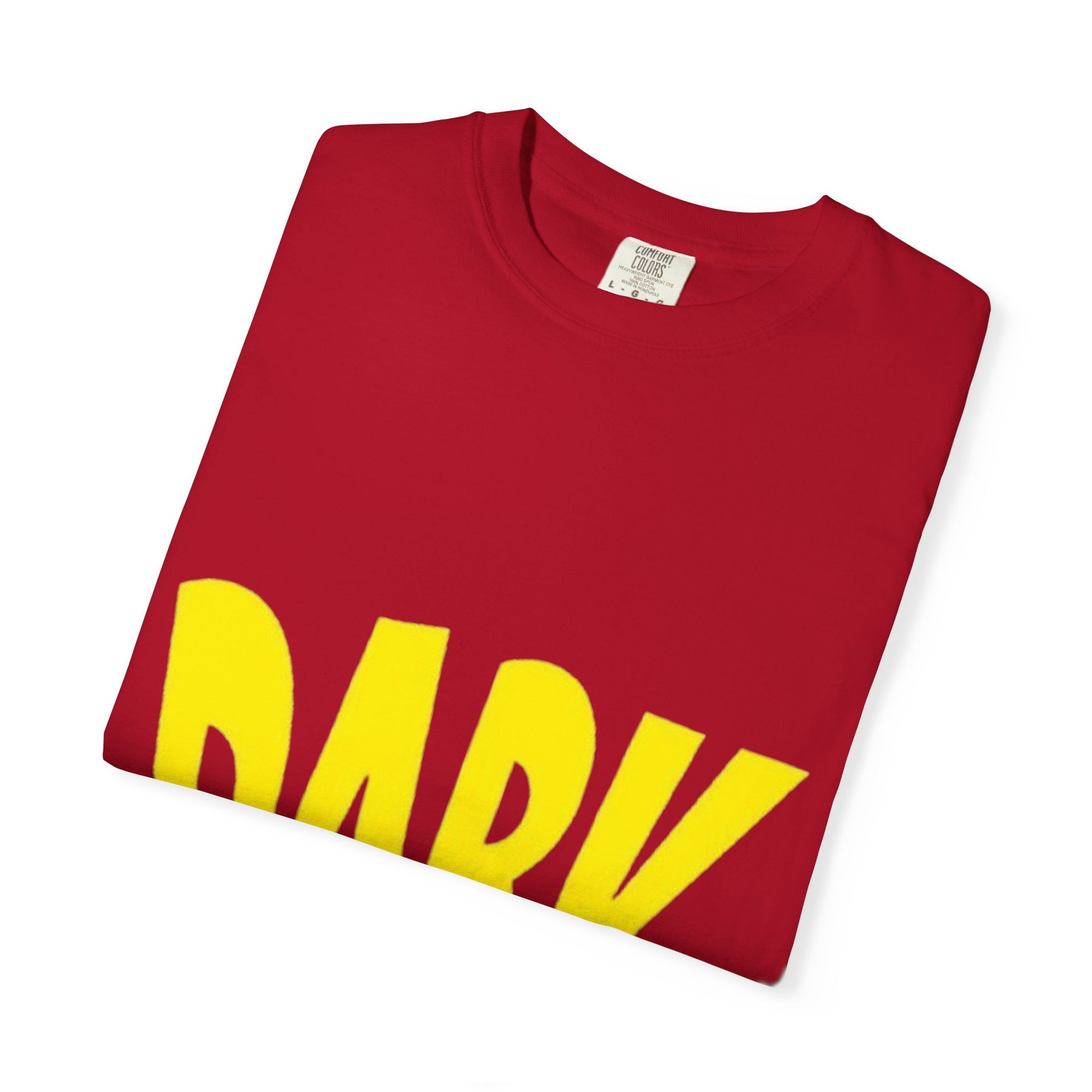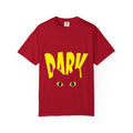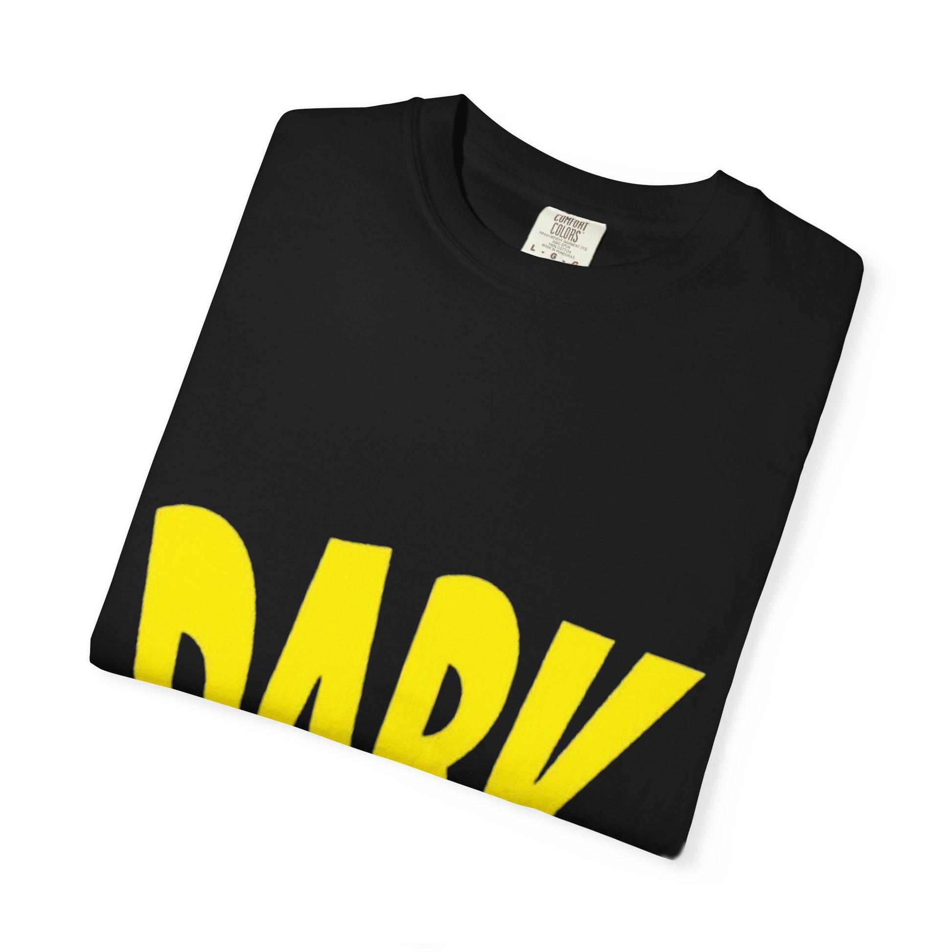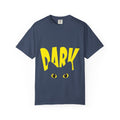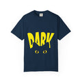 A soft, lived-in tee that settles into your rhythm. This garment-dyed cotton shirt carries a subtle, vintage depth of color and a playful graphic — bold yellow letters arch like a warning above a pair of watchful eyes. It feels like an evening walk through quiet streets: relaxed, slightly mischievous, and quietly confident. Wear it with worn jeans or layer it under a flannel for cool nights. The relaxed fit and medium-weight cotton give it structure without stiffness, and the tubular knit keeps the silhouette clean. It’s a go-to for nights out, casual hangouts, or whenever you want a little sly personality in your outfit.