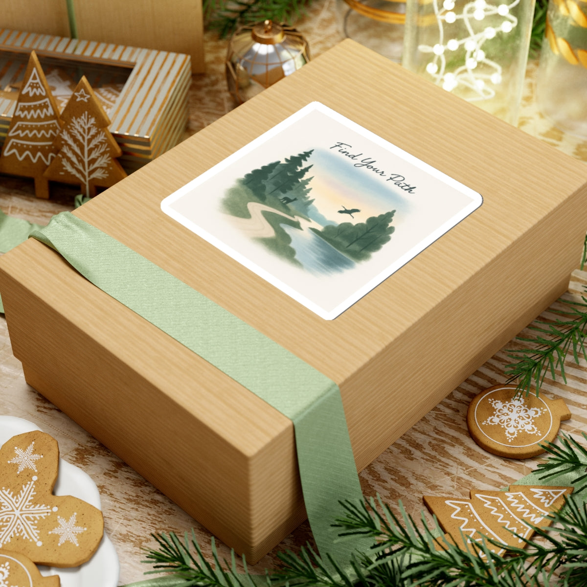 A small, glossy kiss-cut sticker that invites a quiet moment: a soft watercolor landscape of a winding path beside a calm river, framed by pine silhouettes and a soaring bird. The muted sunrise palette and gentle brushwork give it a hand-painted, vintage feel. Stick it on your laptop, journal, water bottle, or window to carry a reminder to breathe, wander, and trust your direction. Lightweight and durable, it settles seamlessly onto smooth surfaces and adds a subtle, nature-inspired accent to your everyday gear.
