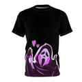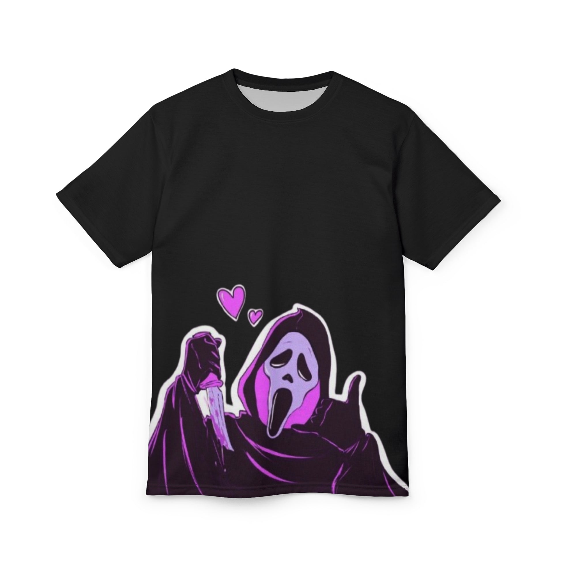 A bold, all-over print tee that turns dark humor into wearable art. The shirt features a stylized, cartoonish reaper with a ghostly scream mask rendered in neon purples and soft pink hearts — spooky and strangely sweet at once. Lightweight, quick-dry polyester keeps the graphic sharp and vibrant, while side seams and shoulder tape maintain the tee’s shape through washes and wear. It sits with a regular, true-to-size fit and a ribbed collar that keeps its silhouette tidy. Wear it when you want to blend playful goth vibes with everyday comfort.