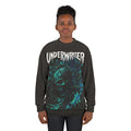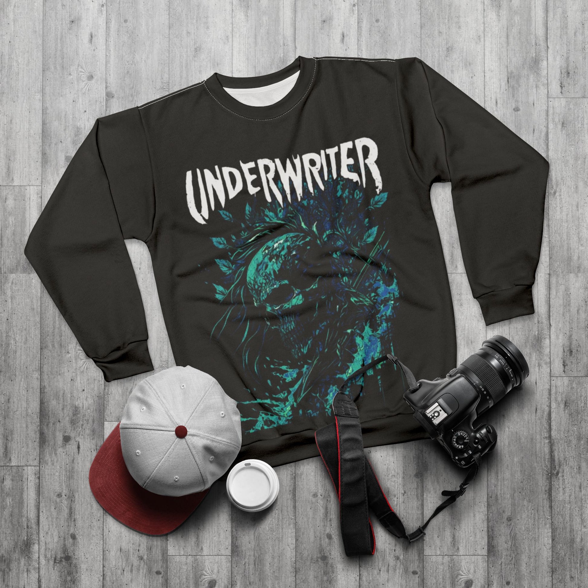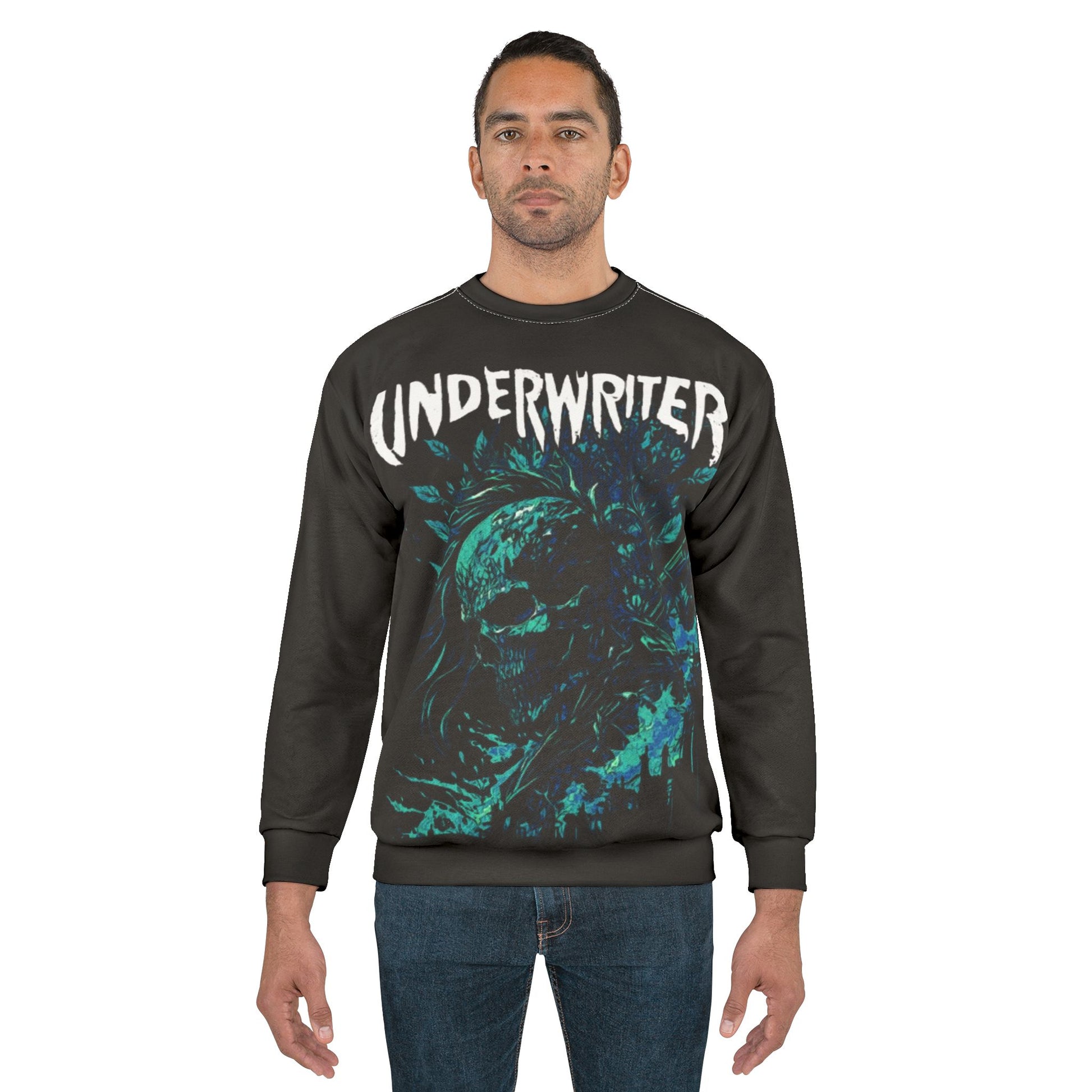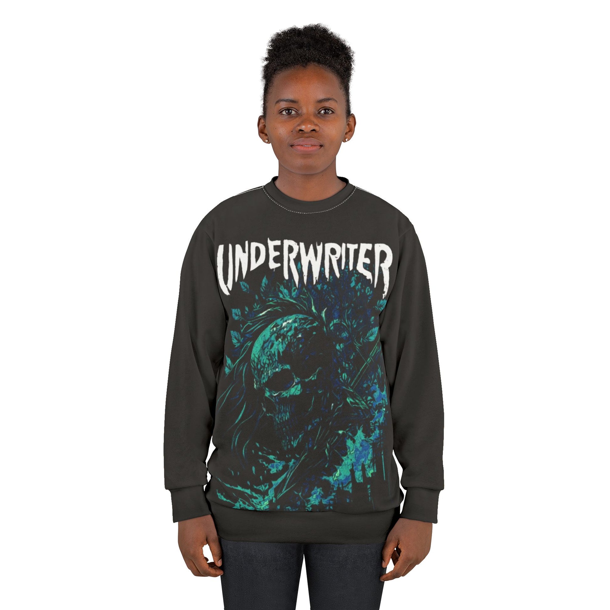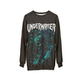 This crew-neck sweatshirt channels moody, underground energy with a full-coverage print of a swirling, oceanic skull and bold “UNDERWRITER” lettering. The rich teal and turquoise tones pop against a deep charcoal background, giving the design a weathered, haunted-punk vibe. Medium-weight polyester keeps the silhouette structured while the ribbed cuffs and collar hold shape through frequent wear. It’s for evenings when you want to stand out without shouting — slipping into something that feels like a soundtrack to late-night shows, basement rehearsals, or rainy city walks.